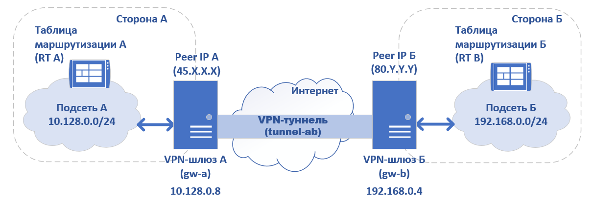 Чтобы настроить маршрутизацию на стороне А VPN-туннеля: