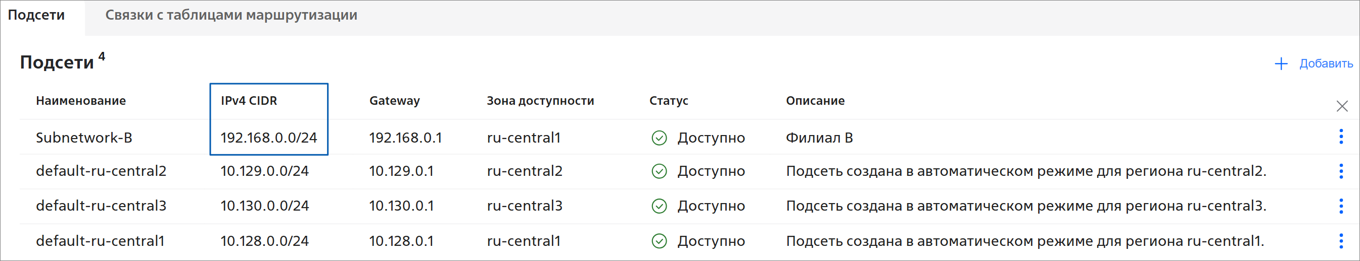 Если в сети Б несколько подсетей, нажмите на кнопку + Добавить подсеть и укажите адрес ещё одной подсети. Таким образом, все подсети Б будут связаны с подсетью А.