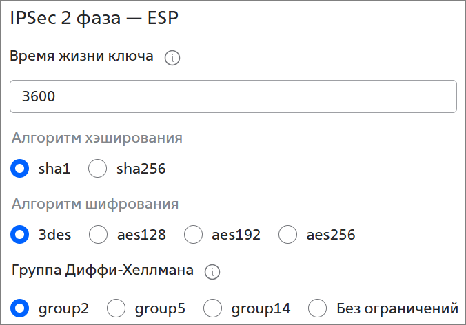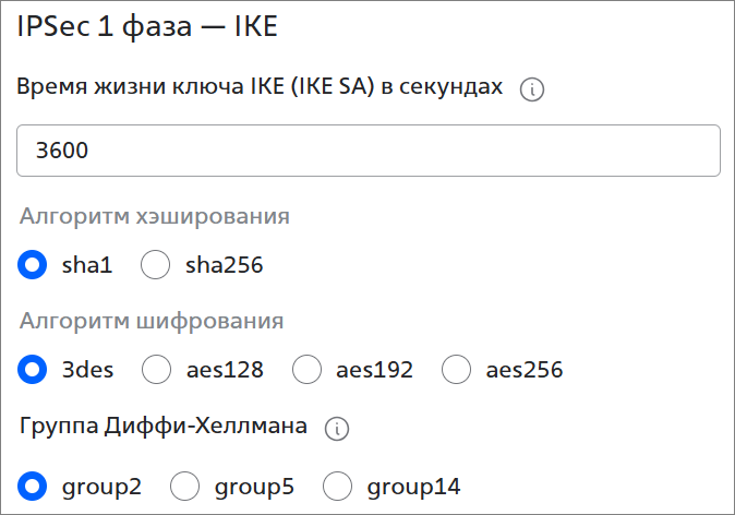 - Время жизни ключа IKE (IKE SA) в секундах — время в диапазоне от 1 до 84600 секунд включительно;