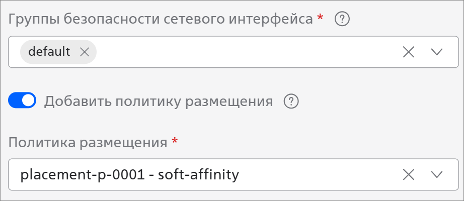 - Добавить политику размещения — активируйте переключатель, чтобы назначить для сервера политику размещения. В поле Политика размещения * выберите нужную политику, которая задаст правило размещения сервера среди гипервизоров. Подробнее см. раздел Политики размещения;
