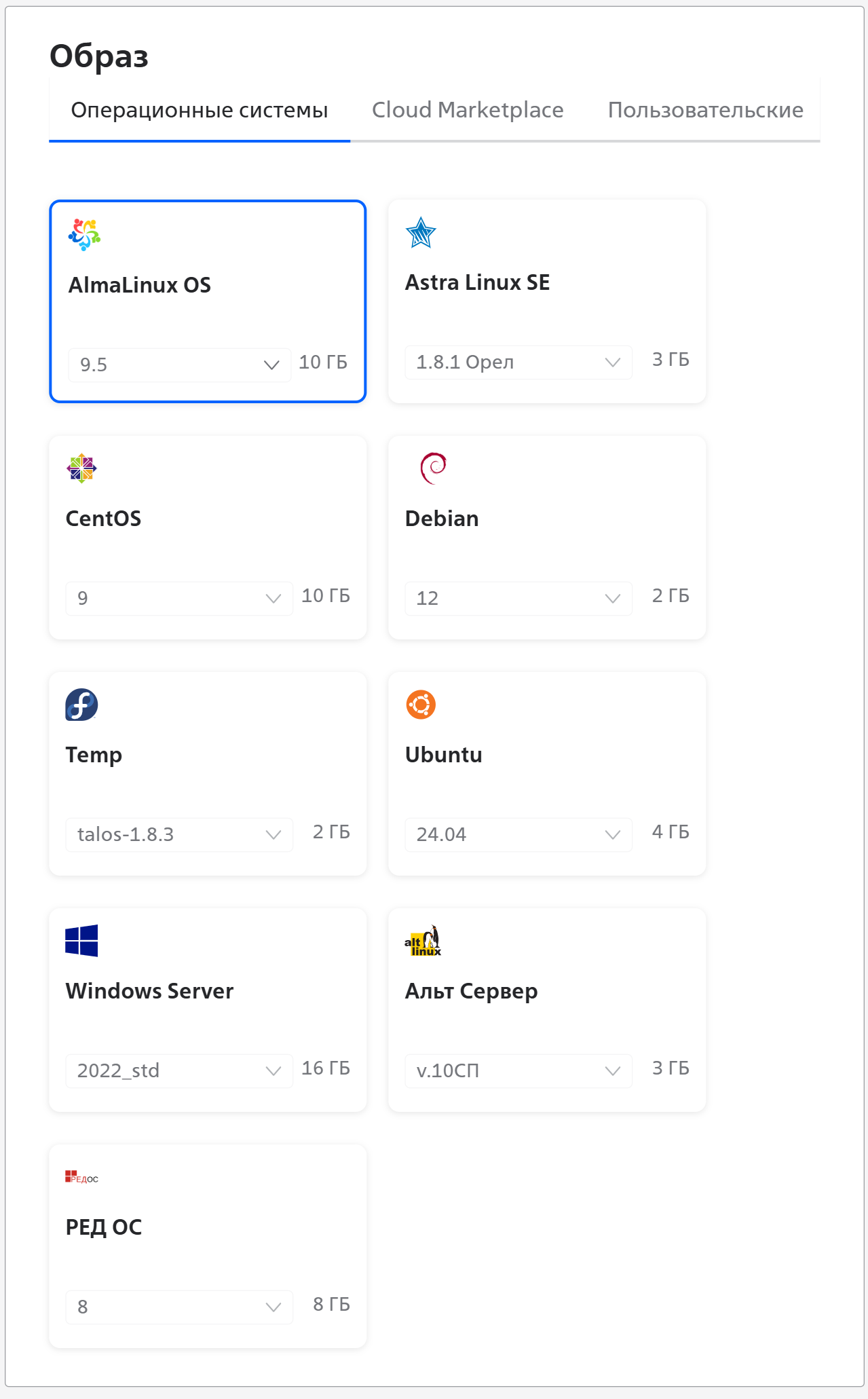 - Пользовательские — образы, созданные пользователем. Подробнее о создании сервера из пользовательского образа см. в разделе Проектные и общие образы.