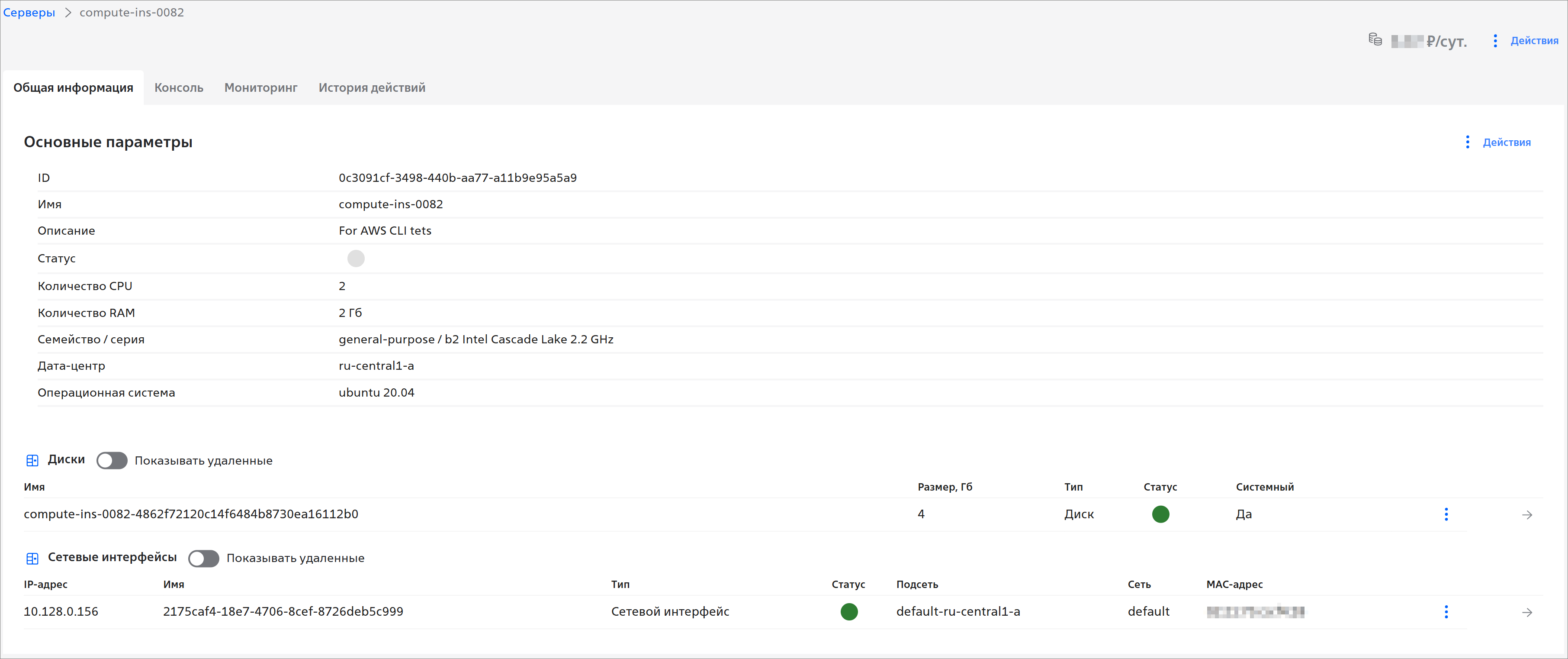 Заказанный сервер можно запустить/приостановить/остановить, изменить его конфигурацию, подключить/отключить публичный IP-адрес. Подробнее см. раздел Действия с сервером.