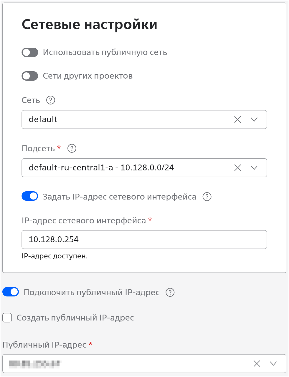 - Сети других проектов — активируйте переключатель, если нужно подключить сервер к подсети другого проекта. Для этого в другом проекте нужно предоставить общий доступ к подсети;