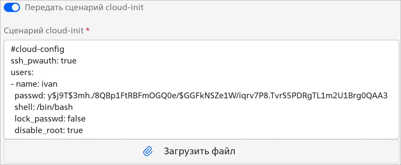 - Передать сценарий cloud-init — активируйте переключатель, чтобы задать свои настройки сервера. Напишите сценарий cloud-init в поле или загрузите текстовый файл. Сценарий может быть в формате YAML или shell: