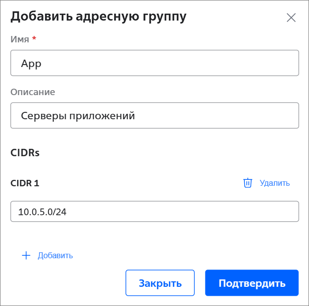 - Описание — описание адресной группы, заполняется при необходимости;