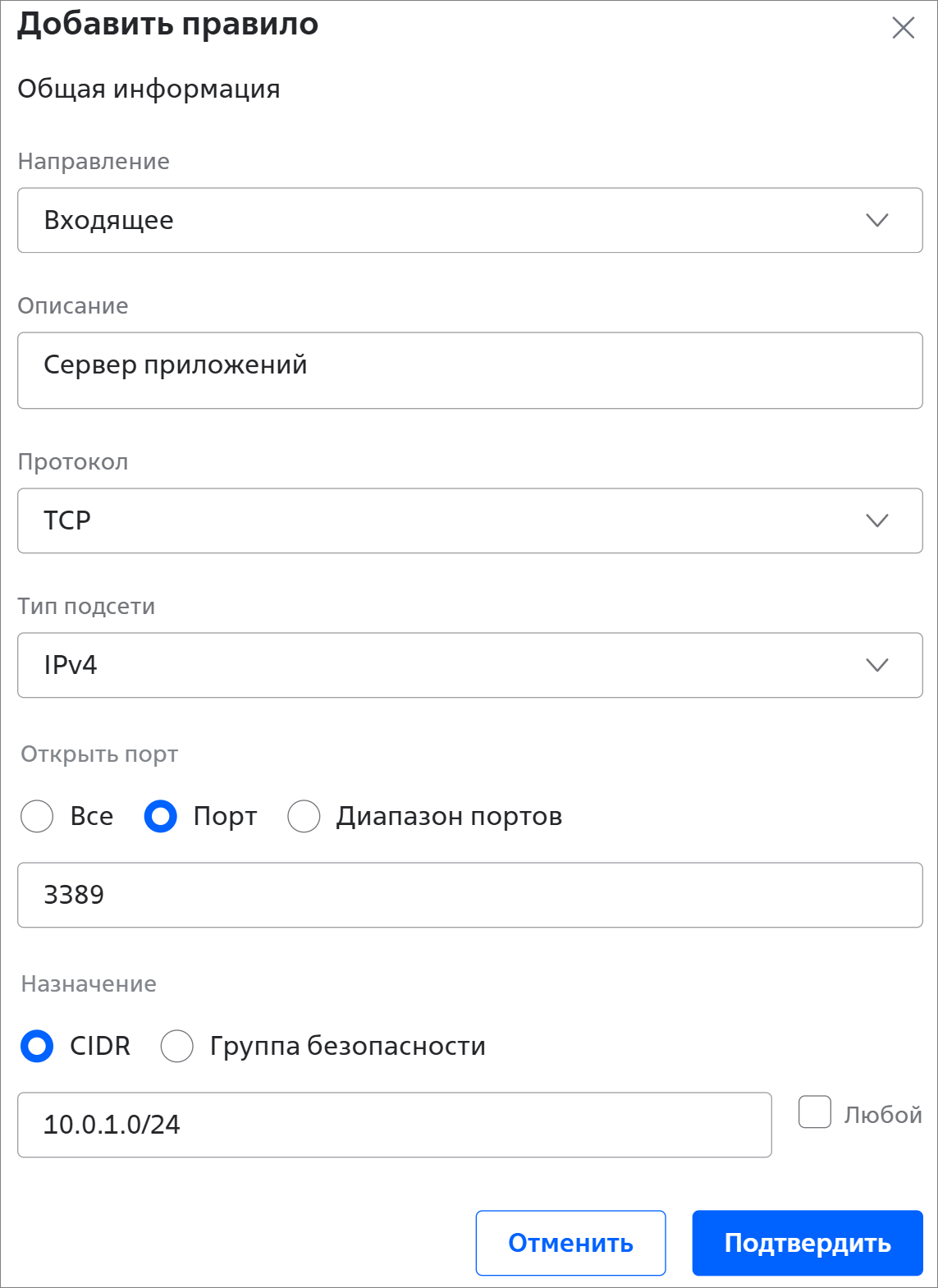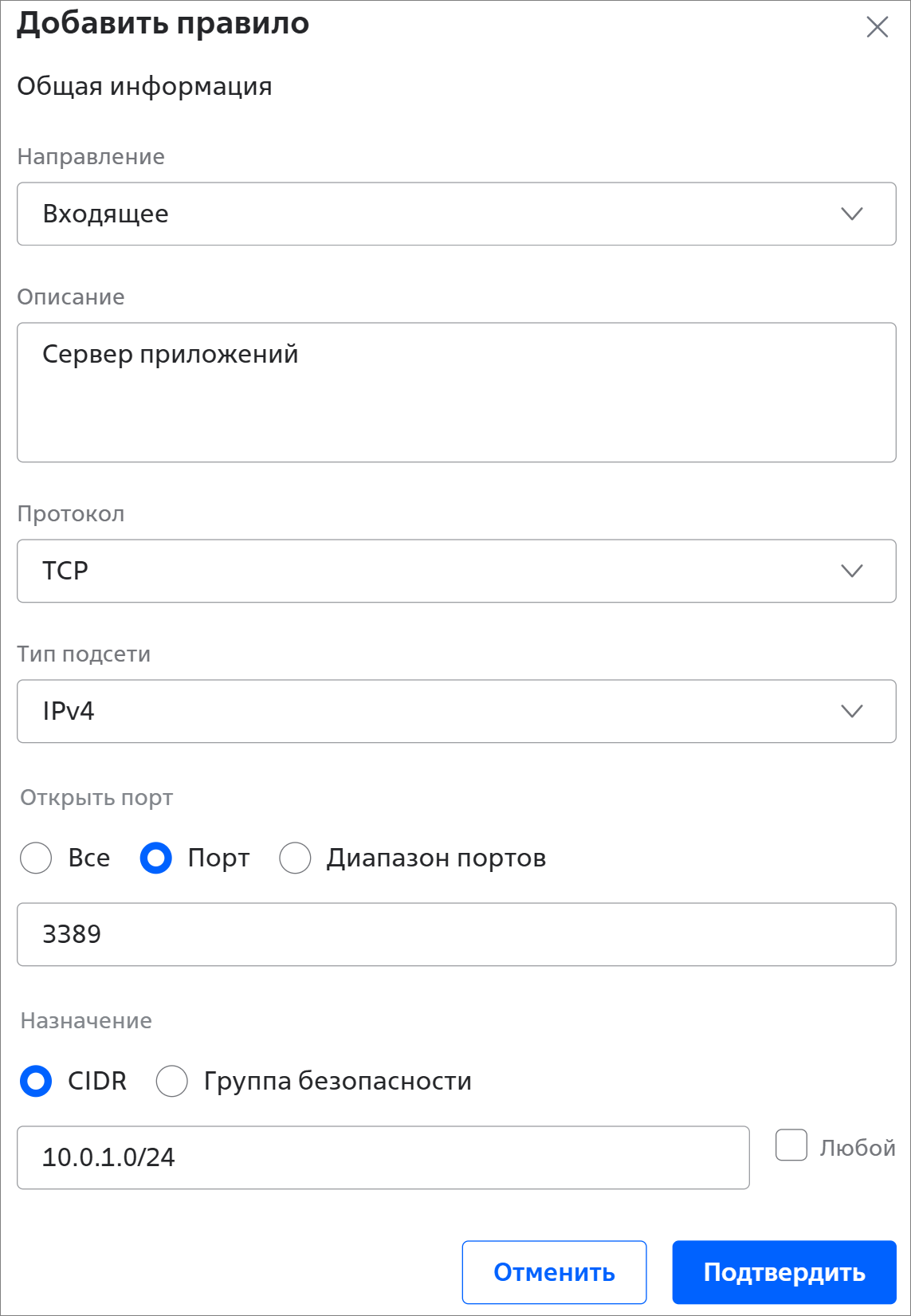 - Группа безопасности — существующая группа безопасности. Правило применяется для серверов, которые используют выбранную группу безопасности.