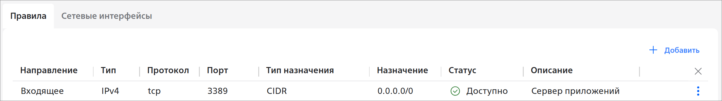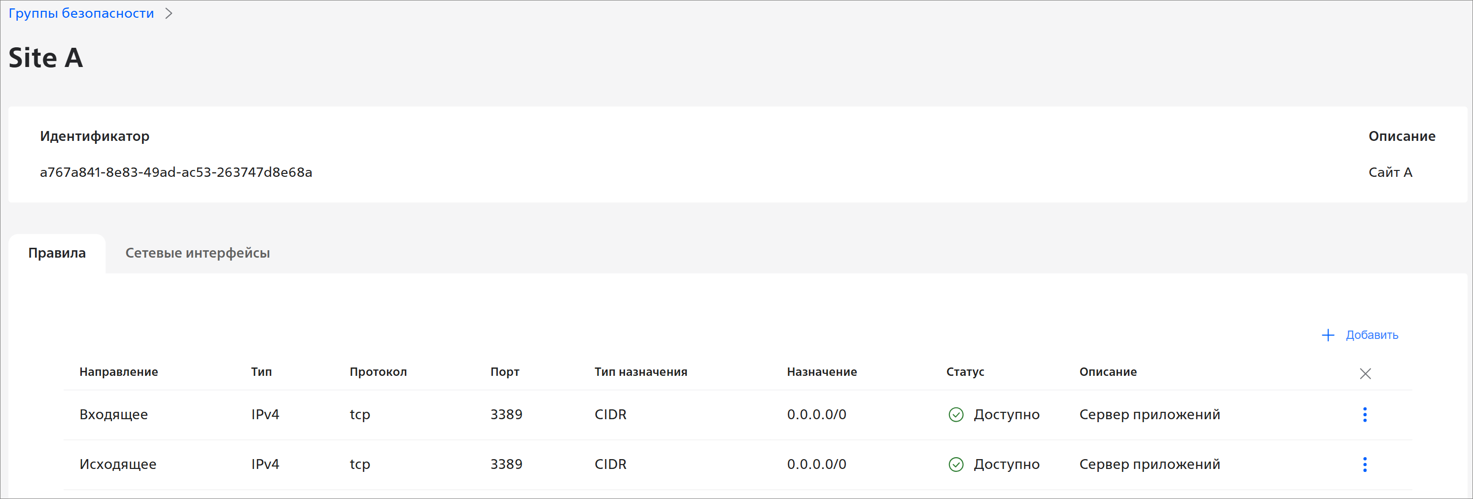 - Направление — направление трафика серверов, входящих в группу безопасности: