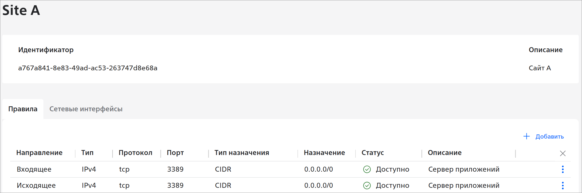 - на вкладке Правила отображаются правила для входящего и исходящего трафика;