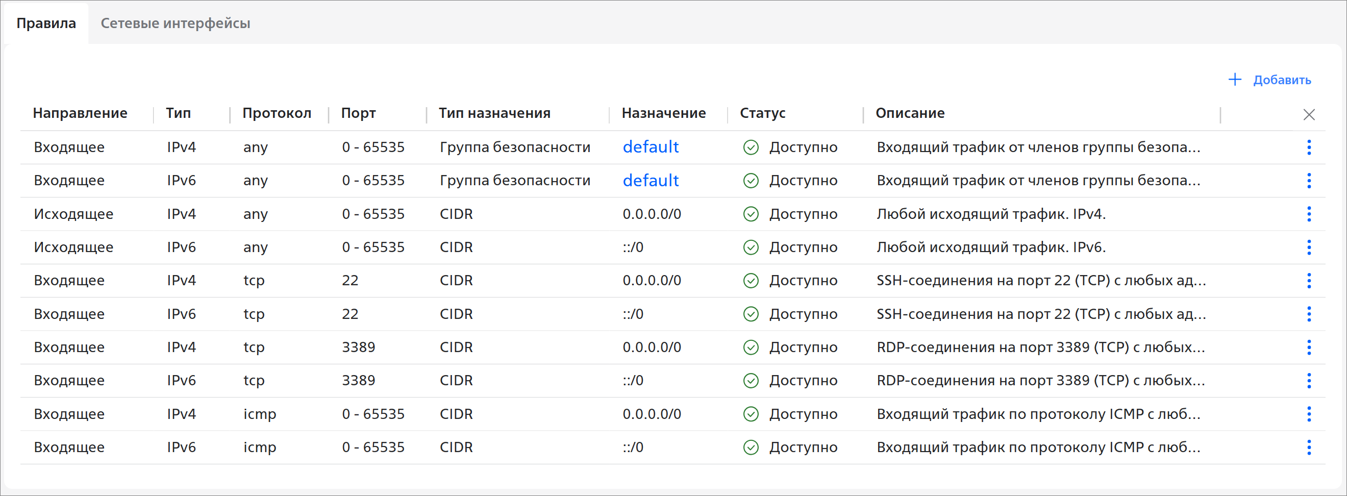 Можно добавлять, изменять и удалять правила группы безопасности, исключать сетевые интерфейсы из неё, а также изменять описание и удалять группы безопасности.