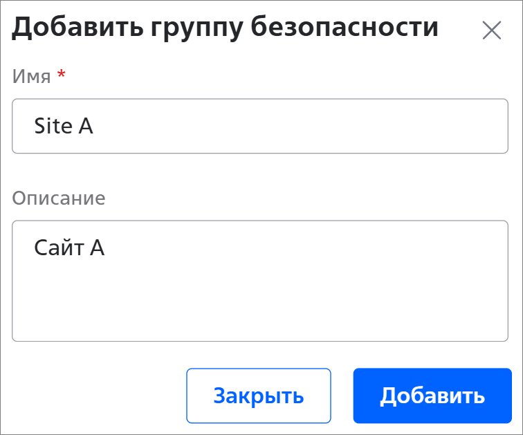 Имя * — название группы безопасности. Может содержать прописные и строчные буквы латинского алфавита, цифры, знаки препинания и символы;