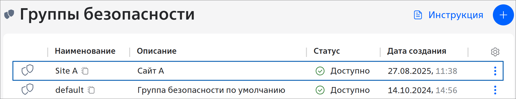 Чтобы посмотреть подробную информацию о группе безопасности, нажмите на строку с нужной группой безопасности. Откроется страница с информацией о ней: