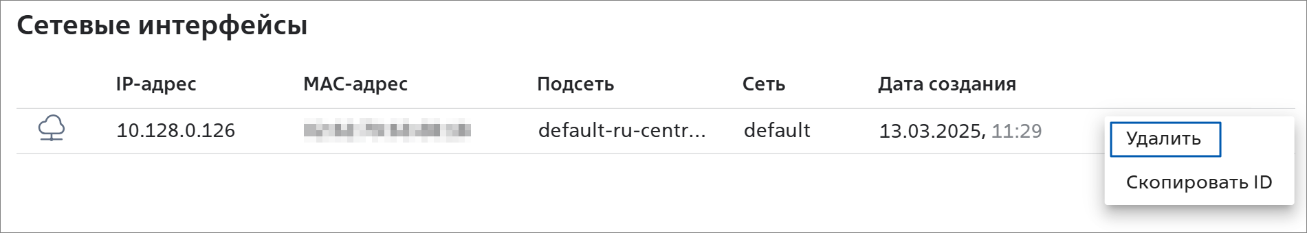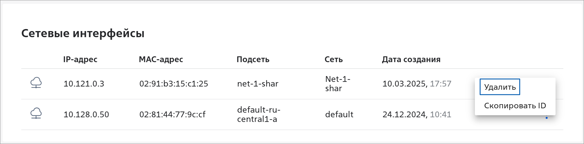 - В разделе Сетевые интерфейсы в строке с сетью, которую нужно отключить, нажмите на кнопку и выберите пункт Удалить: