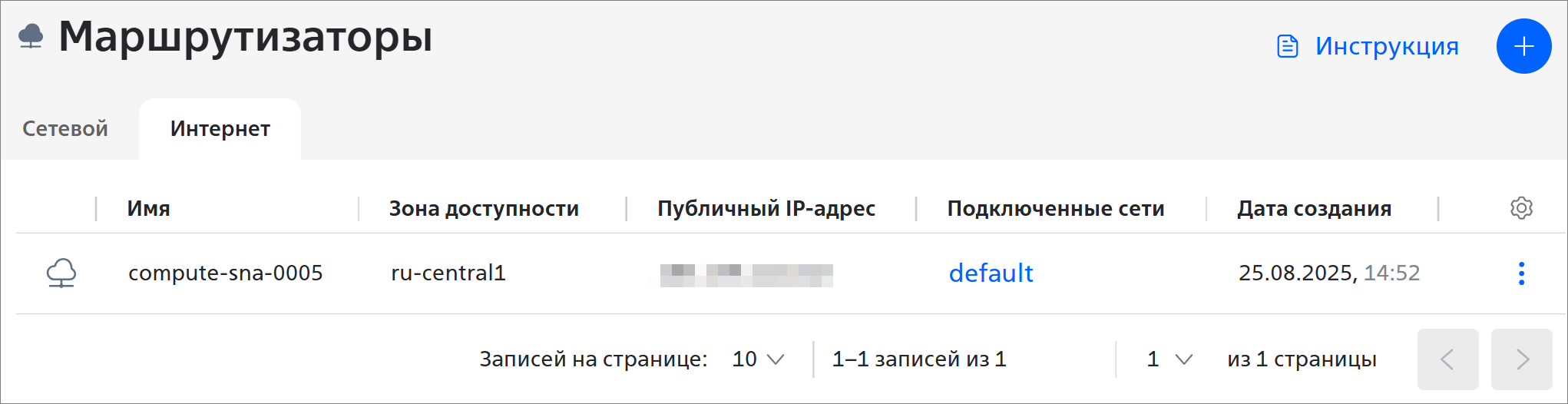 Интернет-маршрутизатор — сервис, обеспечивающий трансляцию IP-адресов внутренних сетей на публичный IP-адрес (SNAT). Интернет-маршрутизатор служит для обеспечения доступа всех серверов из подсети к Интернет. Подробнее см. раздел Взаимодействие сервера с Интернет.