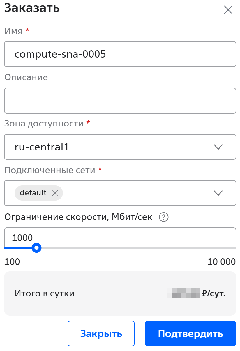 Если доступ к Интернет нужен и для серверов из подсетей другой зоны доступности, создайте ещё один интернет-маршрутизатор в этой зоне доступности. - Ограничение скорости, Мбит/сек — лимит пропускной способности канала. Значение должно быть кратно 100.