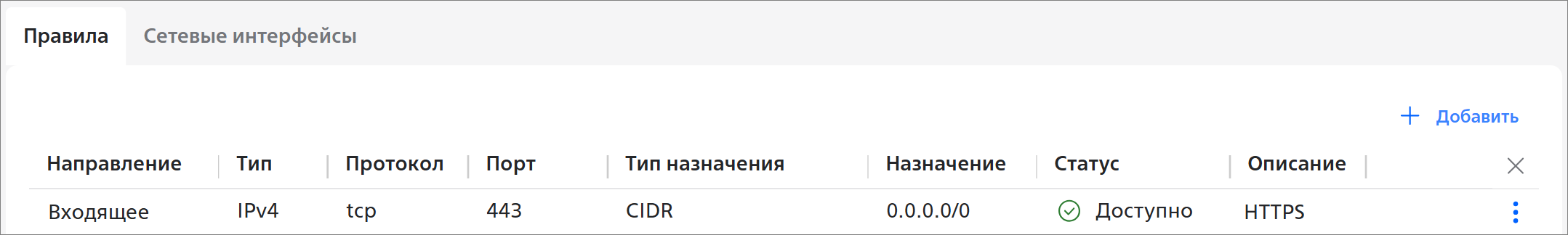 Если сетевой интерфейс сервера не добавлен в группу безопасности default, добавьте его. - В группе безопасности default добавьте правило для входящих соединений, открывающее нужный порт, например, порт 443 для HTTPS-соединений:
