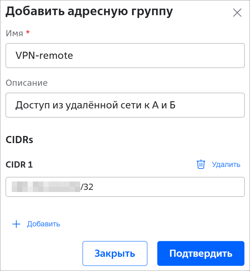 - Создайте адресную группу для VPN-шлюза. В качестве CIDR 1 укажите публичный IP-адрес VPN-шлюза.