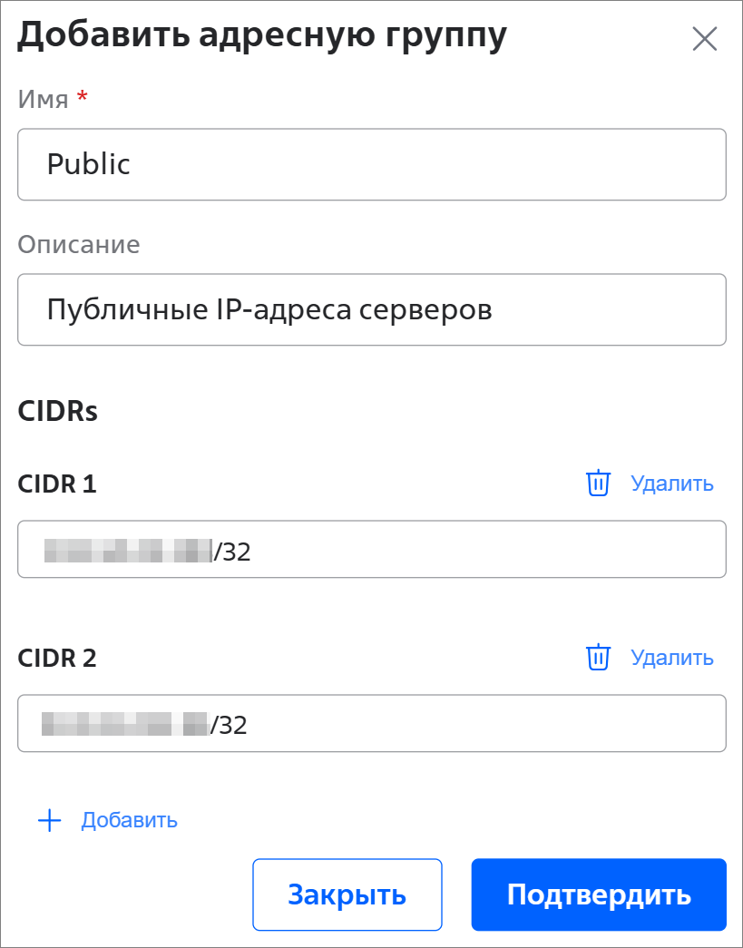 - Создайте адресную группу. В качестве CIDR 1 и CIDR 2 укажите публичные IP-адреса серверов Server-A и Server-B c префиксом /32.