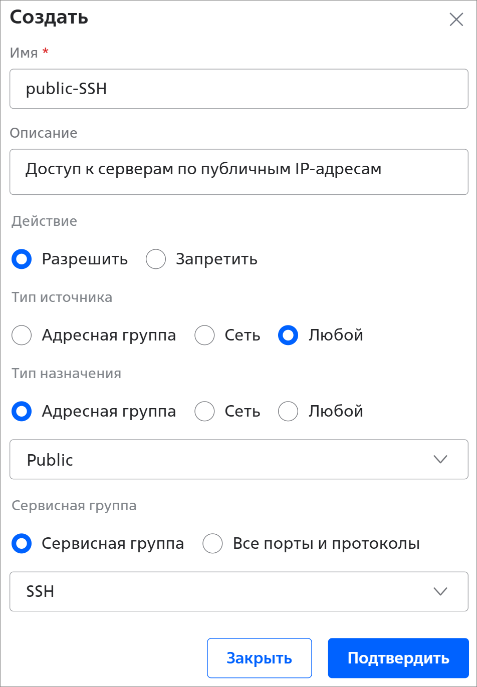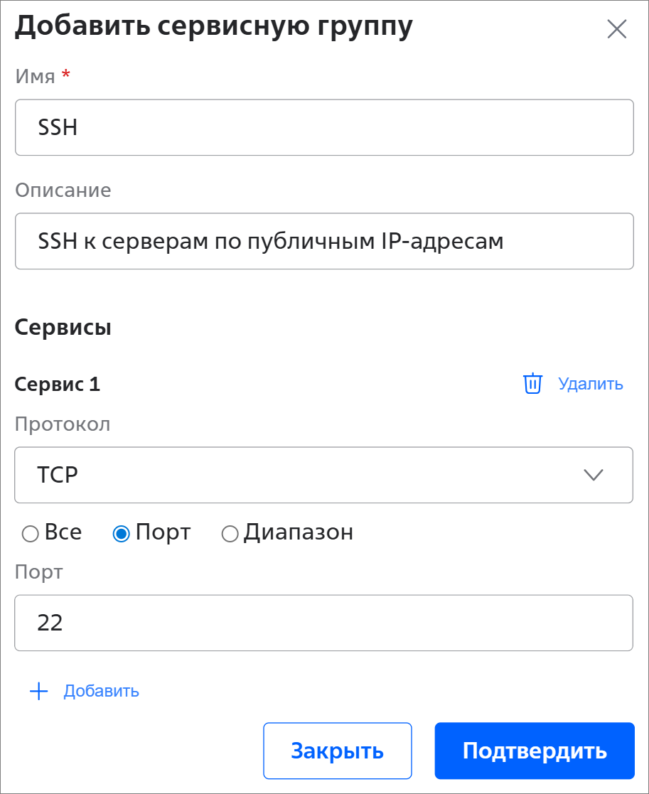 - Создайте сервисную группу, разрешающую прохождение пакетов по протоколу TCP и порту 22.