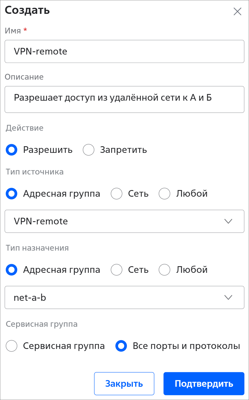 Задача: разрешить прохождение любого трафика от VPN-шлюза к подсетям А и Б.