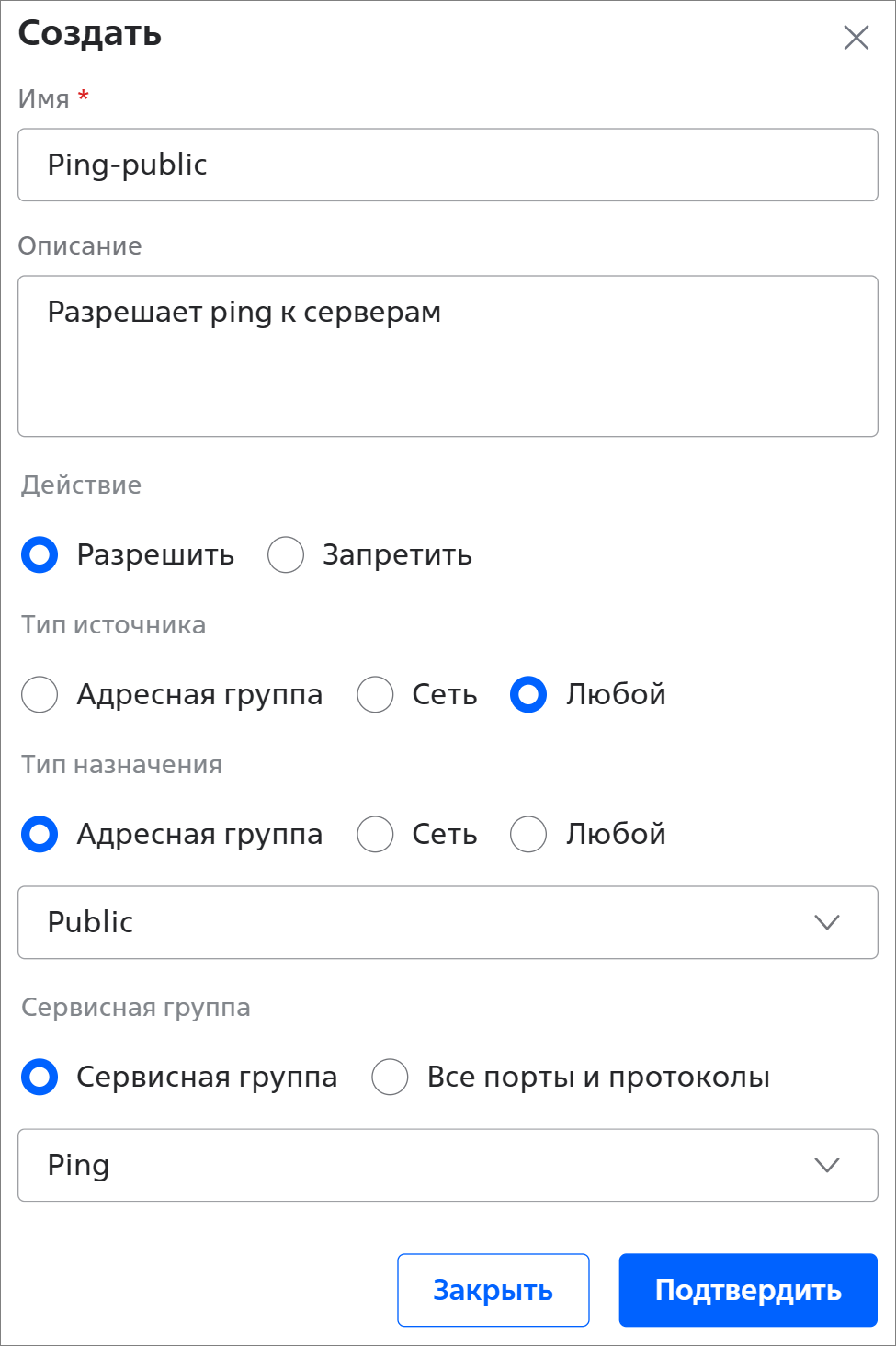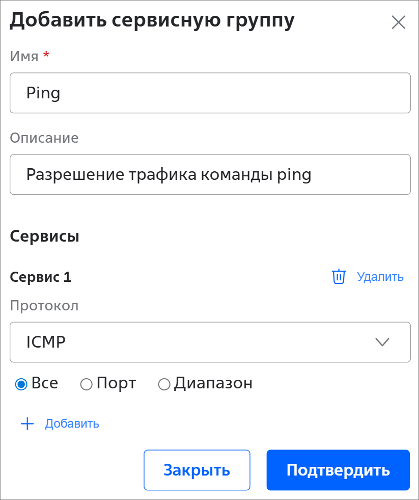 - Создайте сервисную группу, разрешающую прохождение пакетов по протоколу ICMP и любому порту.