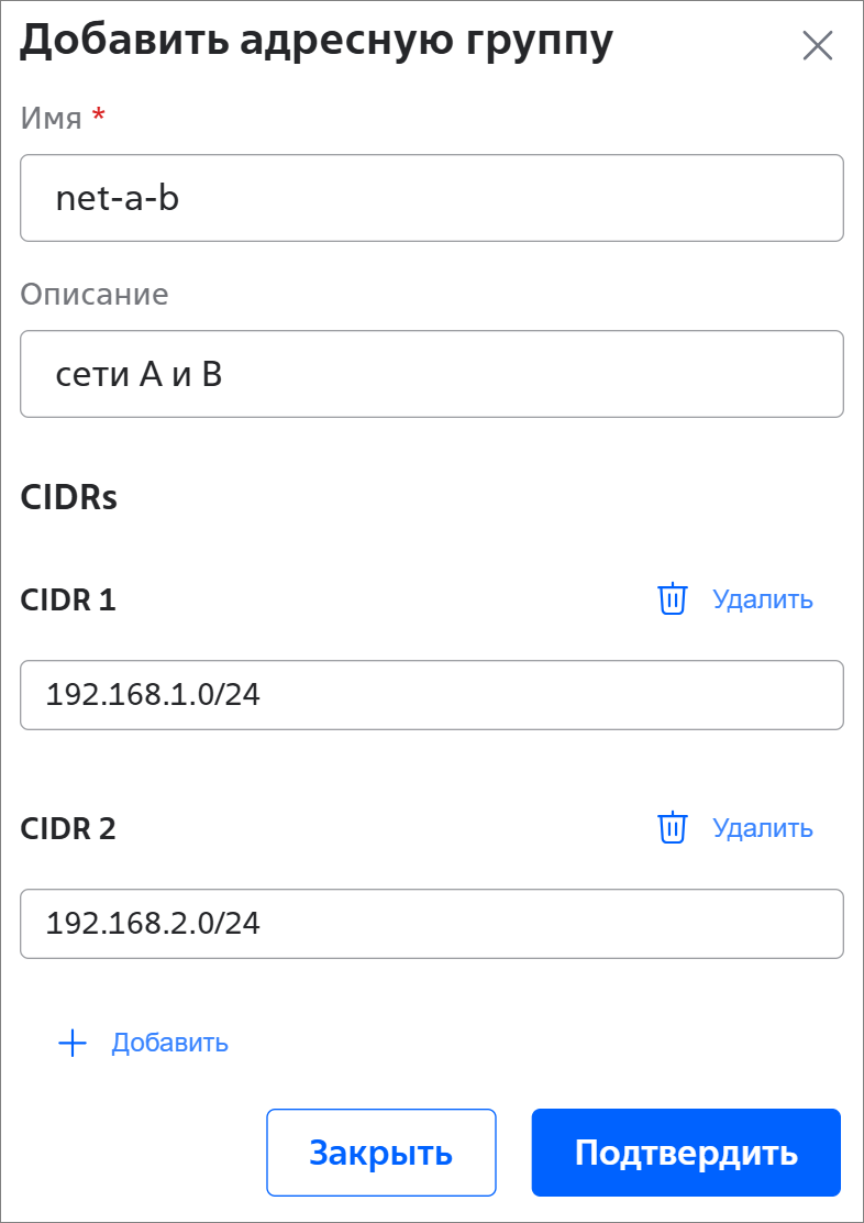 - Создайте адресную группу для подсетей А и Б. В качестве CIDR 1 и CIDR 2 укажите подсети А и Б.