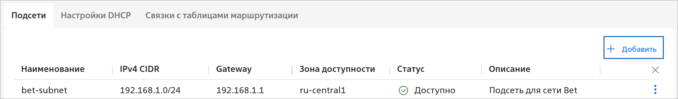- На вкладке Подсети нажмите на кнопку + Добавить: