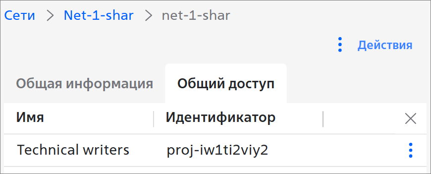 Список проектов, в которых доступна подсеть, отображается на вкладке Общий доступ: