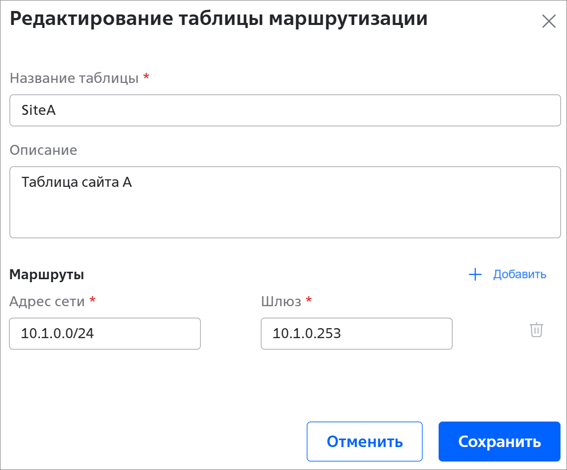 - Адрес сети * — IP-адрес сети назначения с указанием размера подсети. Если размер подсети не указан, то используется префикс /32;