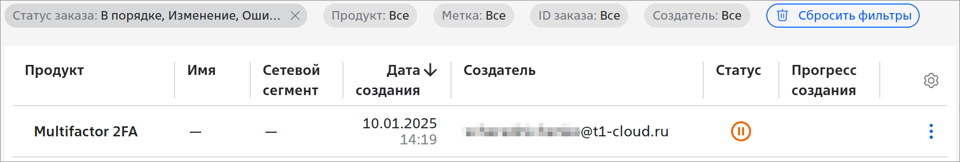 - заказ создаётся со статусом Остановлен и передаётся сотруднику Т1 Облако: