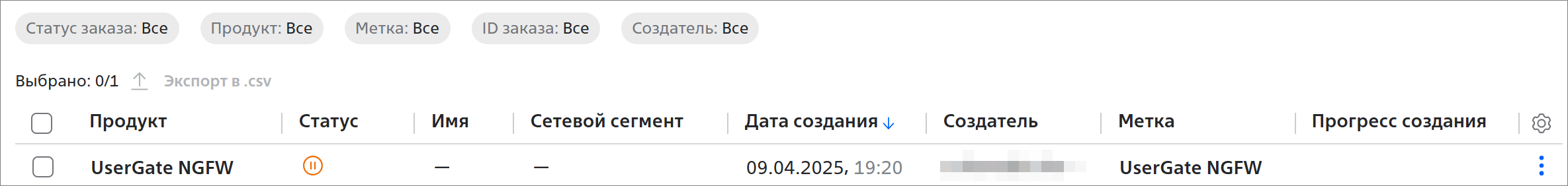 - В главном меню портала перейдите в раздел Ресурсы → Cloud SecaaS → NGFW USERGATE → Заказы.