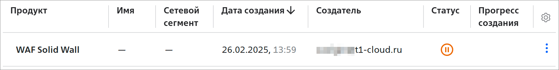 - В главном меню портала перейдите в раздел Ресурсы → Cloud SecaaS → WAF SOLIDWALL → Заказы.