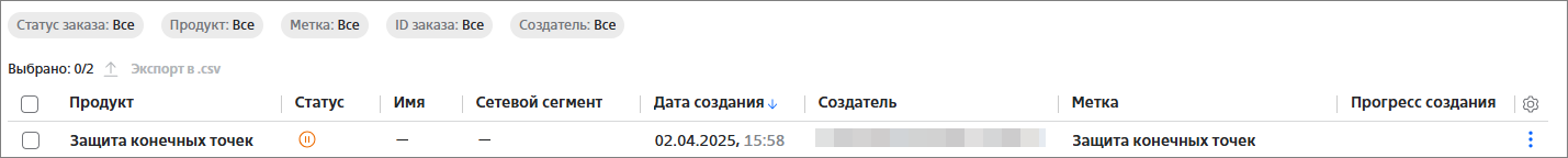 - В главном меню портала перейдите в раздел Ресурсы → Cloud SecaaS → ЗАЩИТА КОНЕЧНЫХ ТОЧЕК → Заказы.