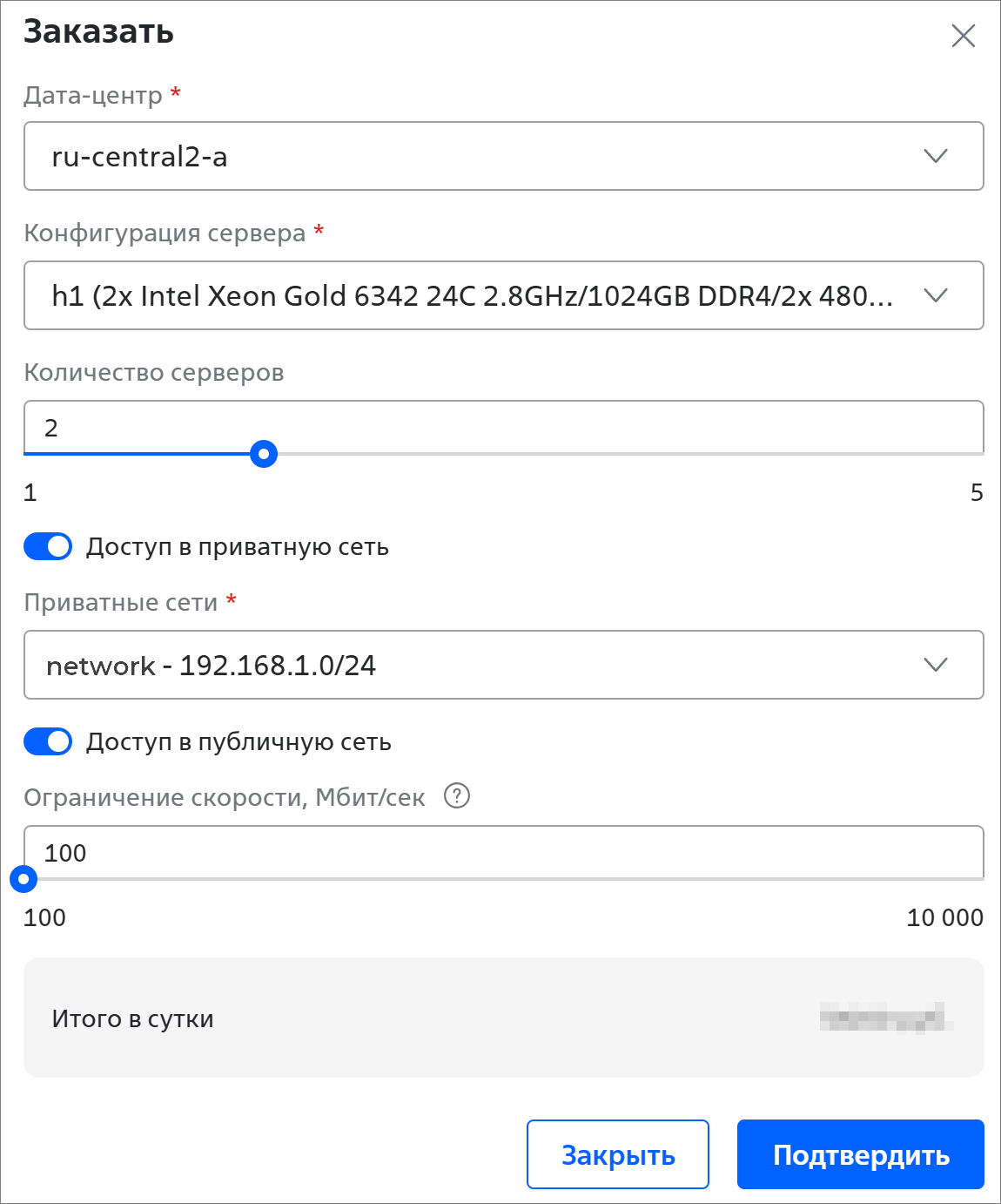 - Дата-центр * — ЦОД, в котором будет находиться сервер;