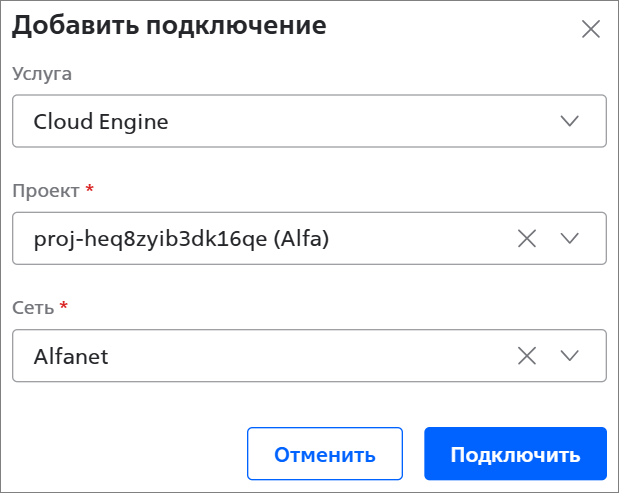 - Проект * — проект, в котором создана сеть. Отображаются проекты организации, в которых подключен сервис Cloud Engine;