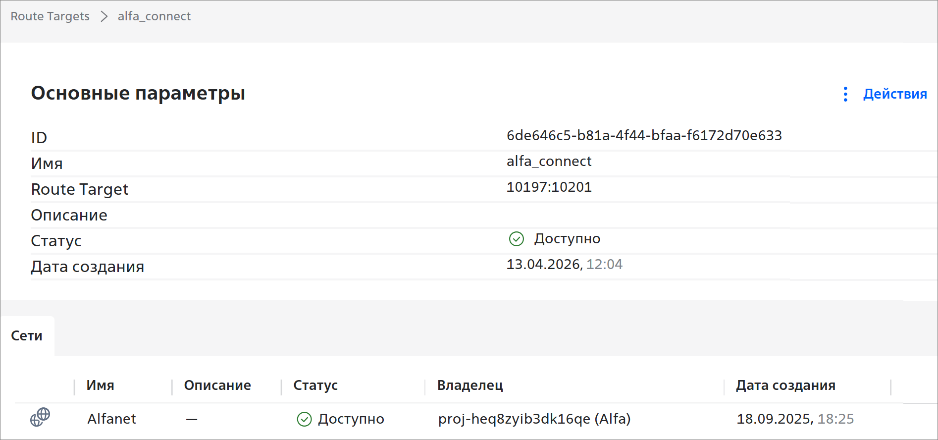 Чтобы посмотреть подробную информацию о Route Target и сетях, подключенных к нему, нажмите на строку с нужным Route Target. Откроется страница с информацией о нём: