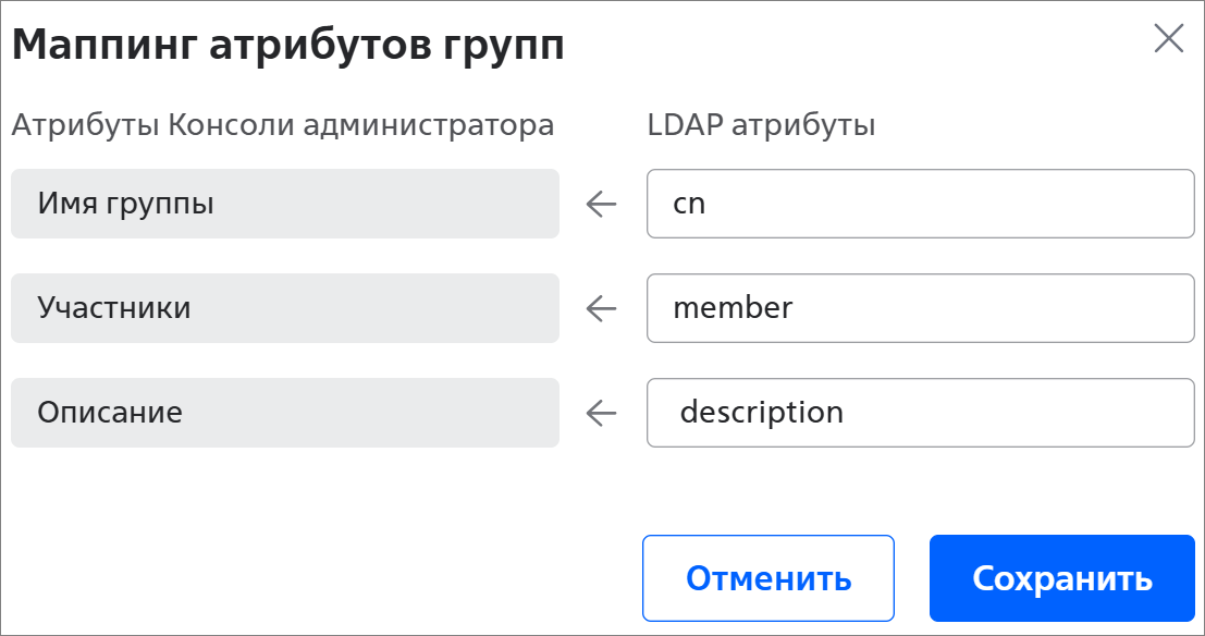 Маппинг атрибутов LDAP — это процесс сопоставления атрибутов из каталога LDAP (например, Active Directory) с атрибутами в консоли администратора. Маппинг необходим для корректного добавления и обновления данных пользователей и групп в консоли администратора при синхронизации каталога LDAP.