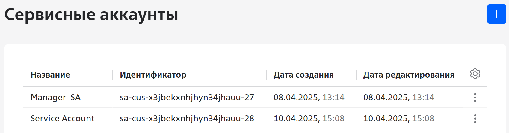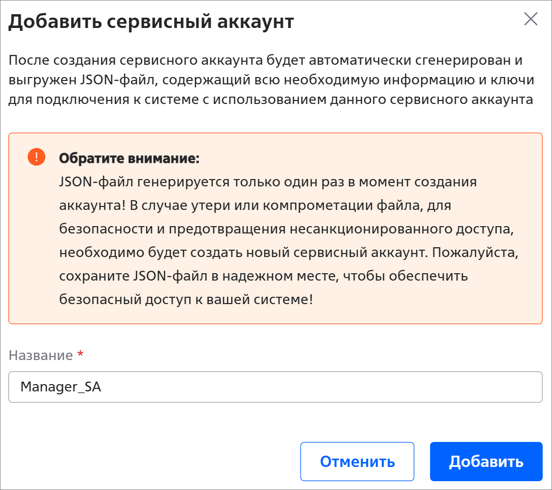 Создание, изменение, назначение роли и удаление сервисных аккаунтов доступно только пользователю и сервисному аккаунту с ролью Суперадминистратор.
