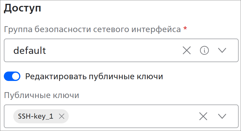 - Публичные ключи — добавьте или удалите SSH-ключи (пары криптографических ключей, которые обеспечивают безопасный канал связи для доступа к главному узлу по сетевому протоколу Secure Shell (SSH)). Если нужного SSH-ключа нет, создайте его и добавьте на портал. Подробнее см. раздел SSH-ключи.