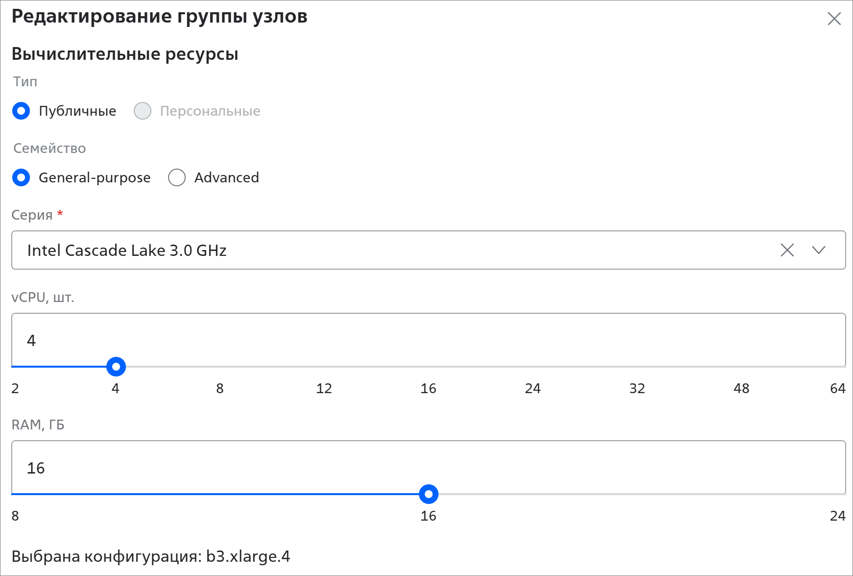 - Выбрана конфигурация — конфигурация сервера определяется автоматически на основании выбранного количества процессоров (vCPU) и объёма оперативной памяти (RAM). Подробнее см. раздел Конфигурации сервера.