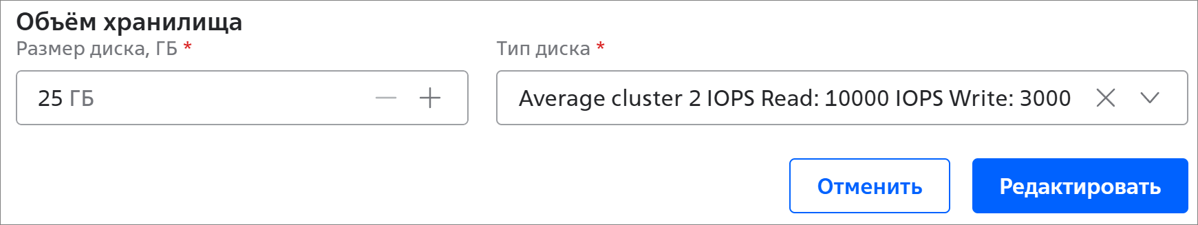Объём хранилища:- Размер диска, ГБ * — объём диска каждого рабочего узла кластера, от 25 ГБ до 2048 ГБ;