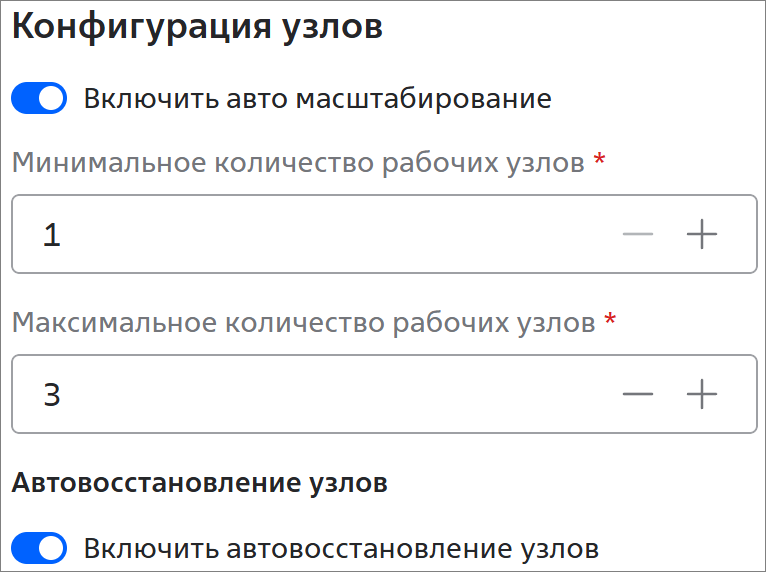 Автовосстановление узлов:- Включить автовосстановление узлов — активируйте переключатель, если требуется автоматическое восстановление рабочих узлов при сбое.