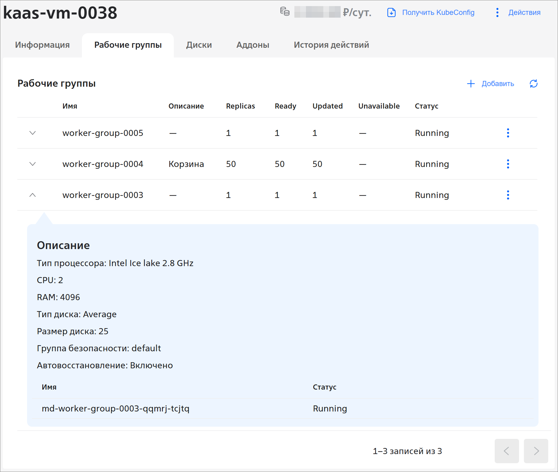 - Ready — количество работающих узлов в группе (в статусе Running);