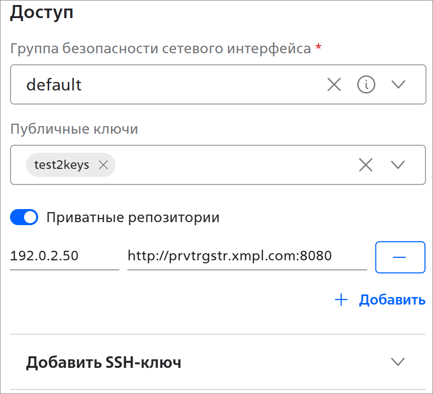 - Приватные репозитории — активируйте переключатель, если нужно настроить доступ узлов рабочей группы к закрытым репозиториям образов контейнеров. Если переключатель активирован, укажите параметры репозитория: