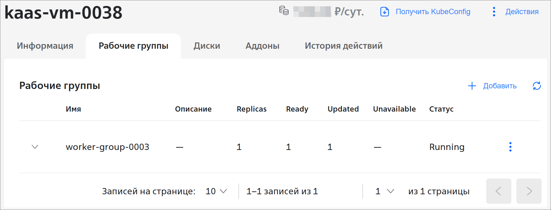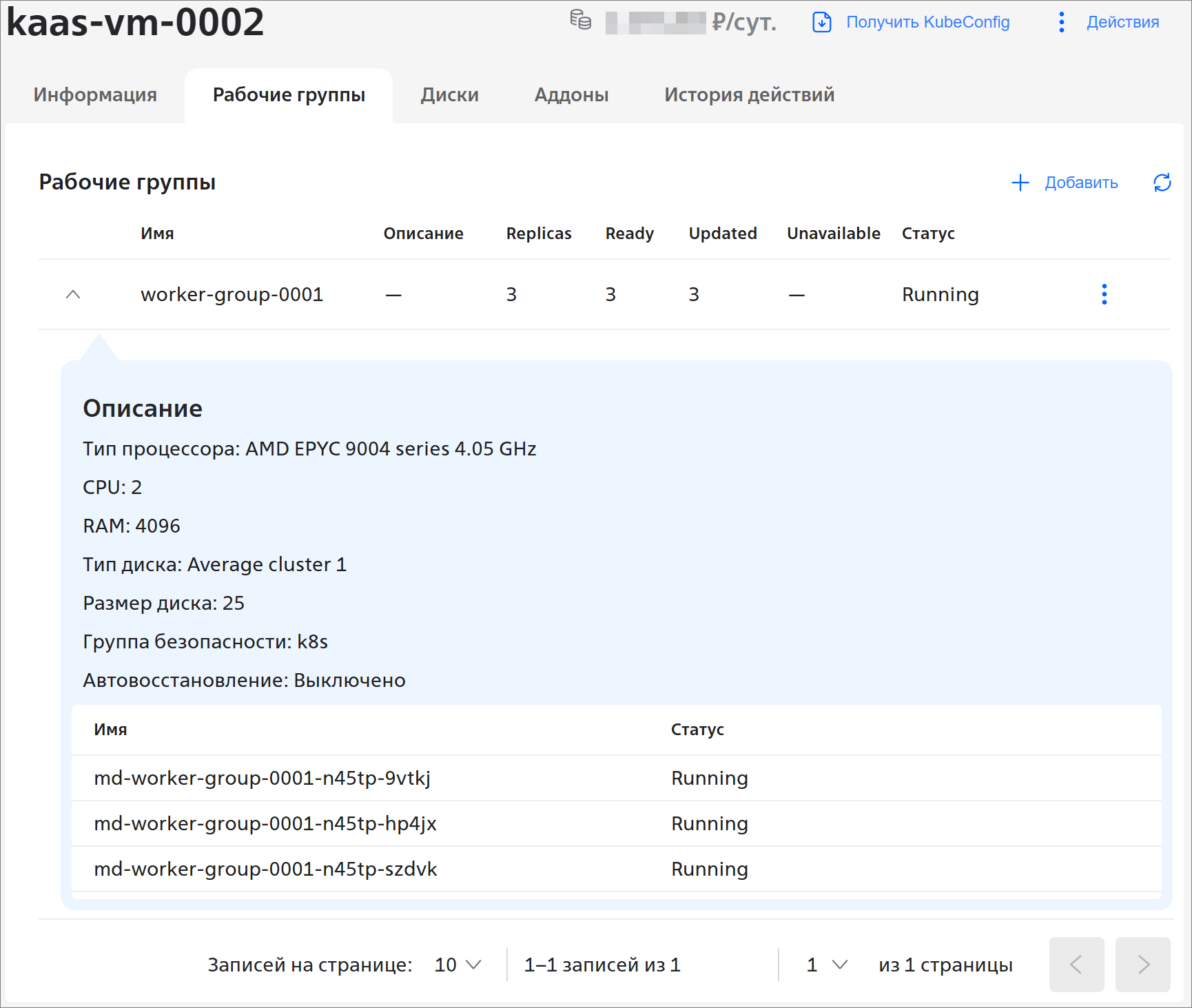 , чтобы увидеть детальную информацию о рабочей группе, в том числе о статусе каждого узла:У рабочей группы можно изменить количество узлов, вычислительные ресурсы, размер и тип диска, а также можно удалить рабочую группу. Подробнее см. раздел Действия с рабочей группой Kubernetes as a Service.