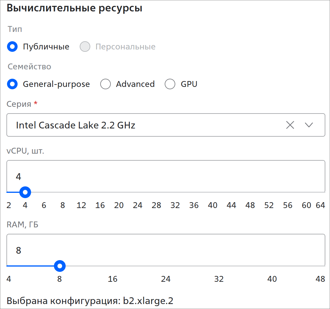 - Выбрана конфигурация — конфигурация узла определяется автоматически на основании выбранного количества процессоров (vCPU) и объёма оперативной памяти (RAM). Подробнее см. раздел Конфигурации сервера.
