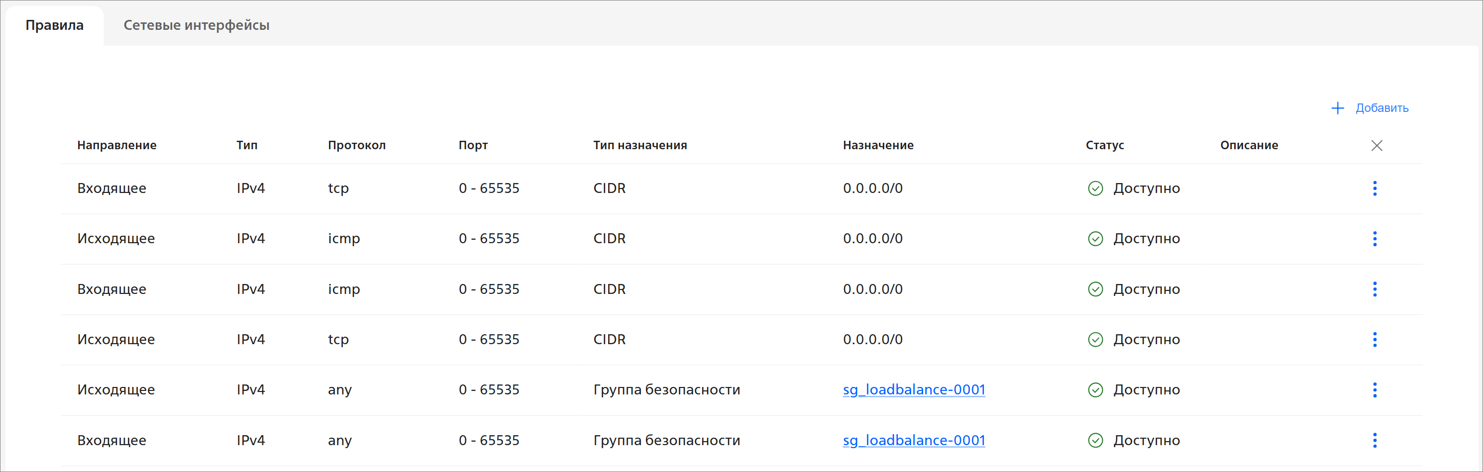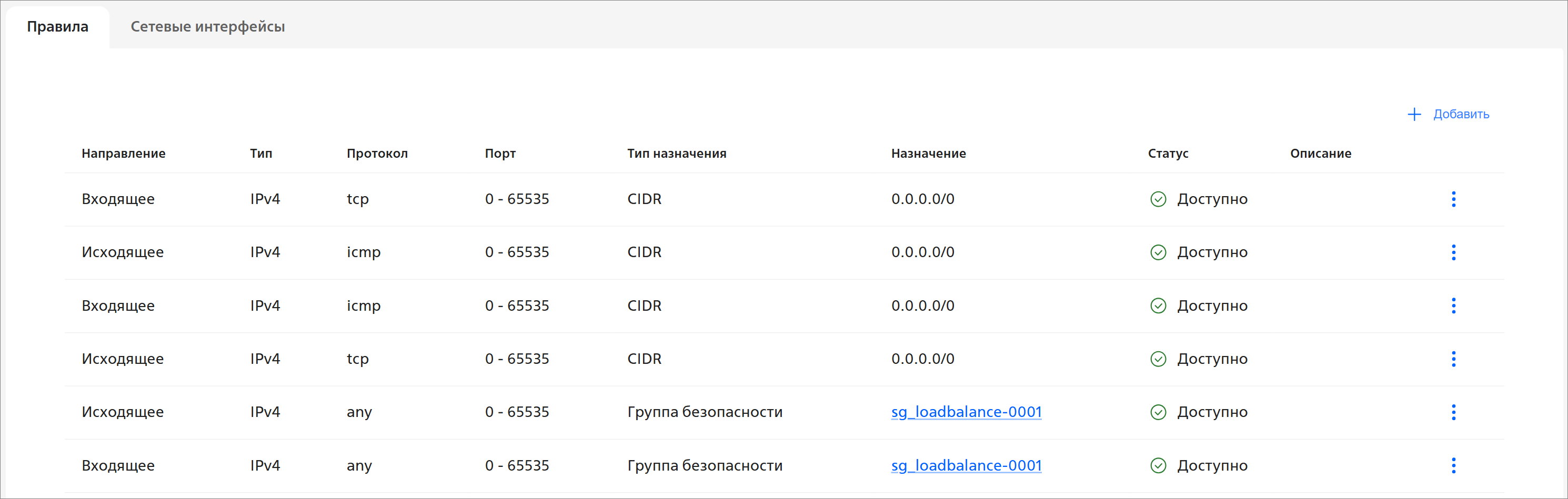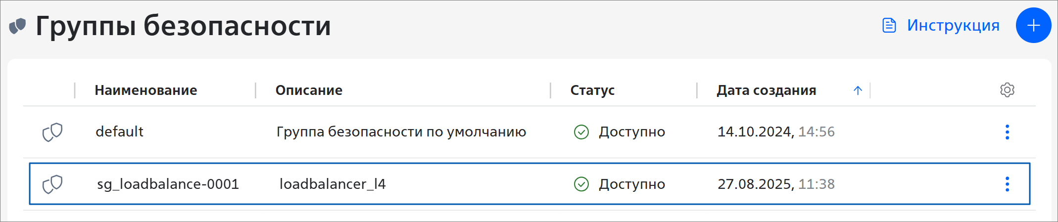 Если при создании балансировщика Load Balancer не был активирован переключатель Выбрать группу безопасности из доступных, то группа безопасности sg_<имя балансировщика> создаётся автоматически: