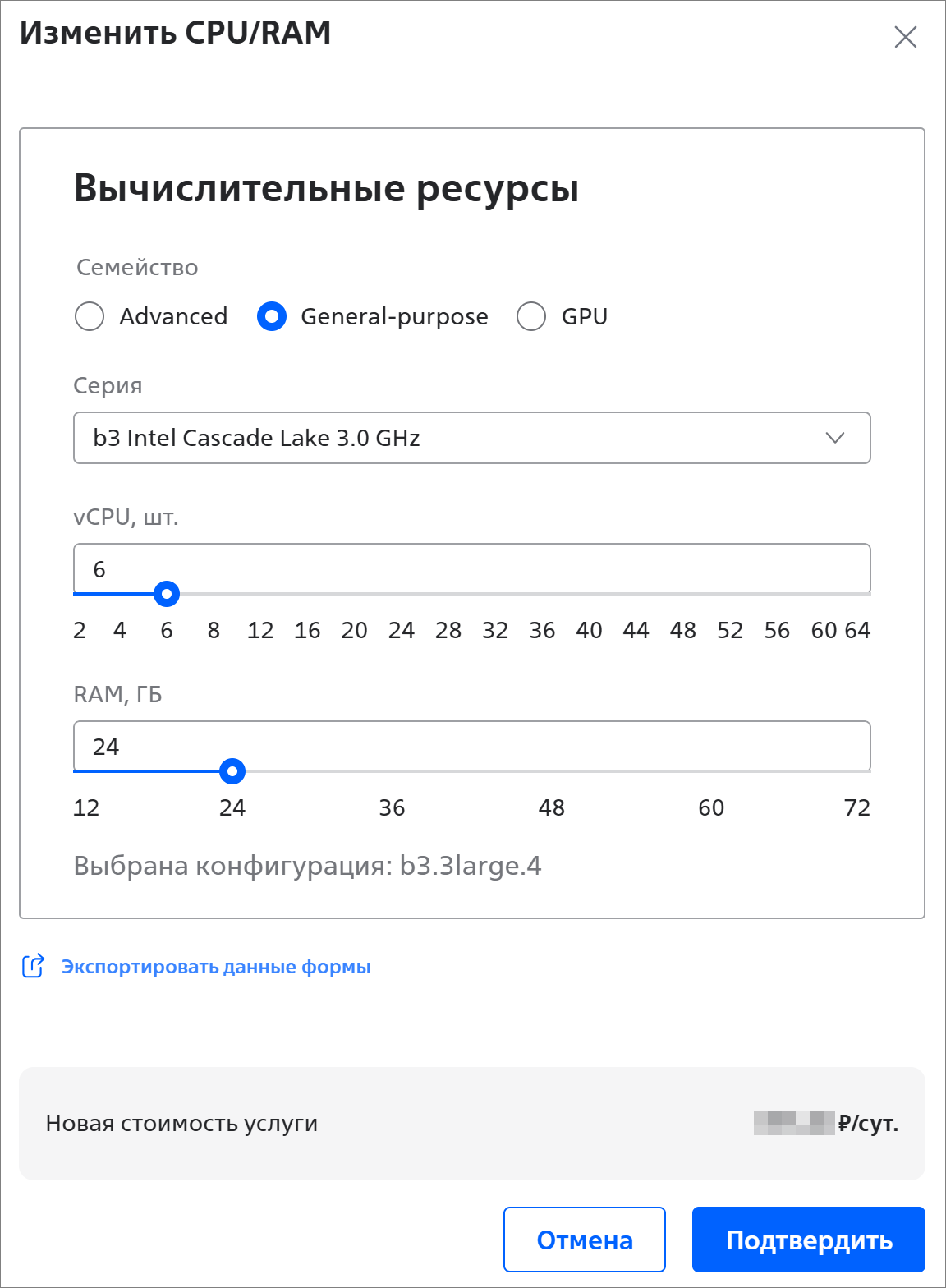 - b3 Intel Cascade Lake 3.0 GHz — для задач, требующих высокой тактовой частоты vCPU. Например, для высоконагруженных веб-приложений (Python, Java), транзакционных нагрузок (1С, ERP-системы);