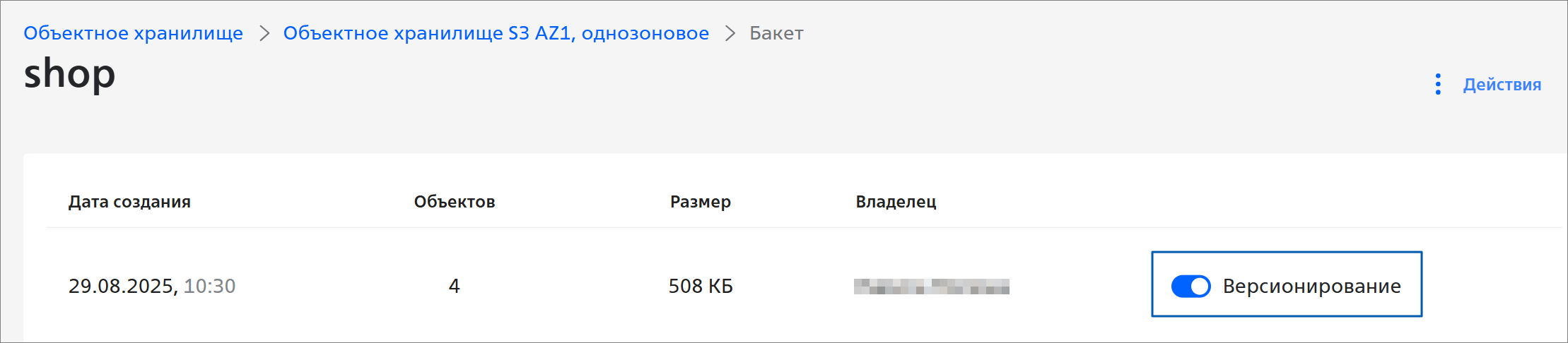 - Нажмите на строку с бакетом, для которого нужно включить версионирование.