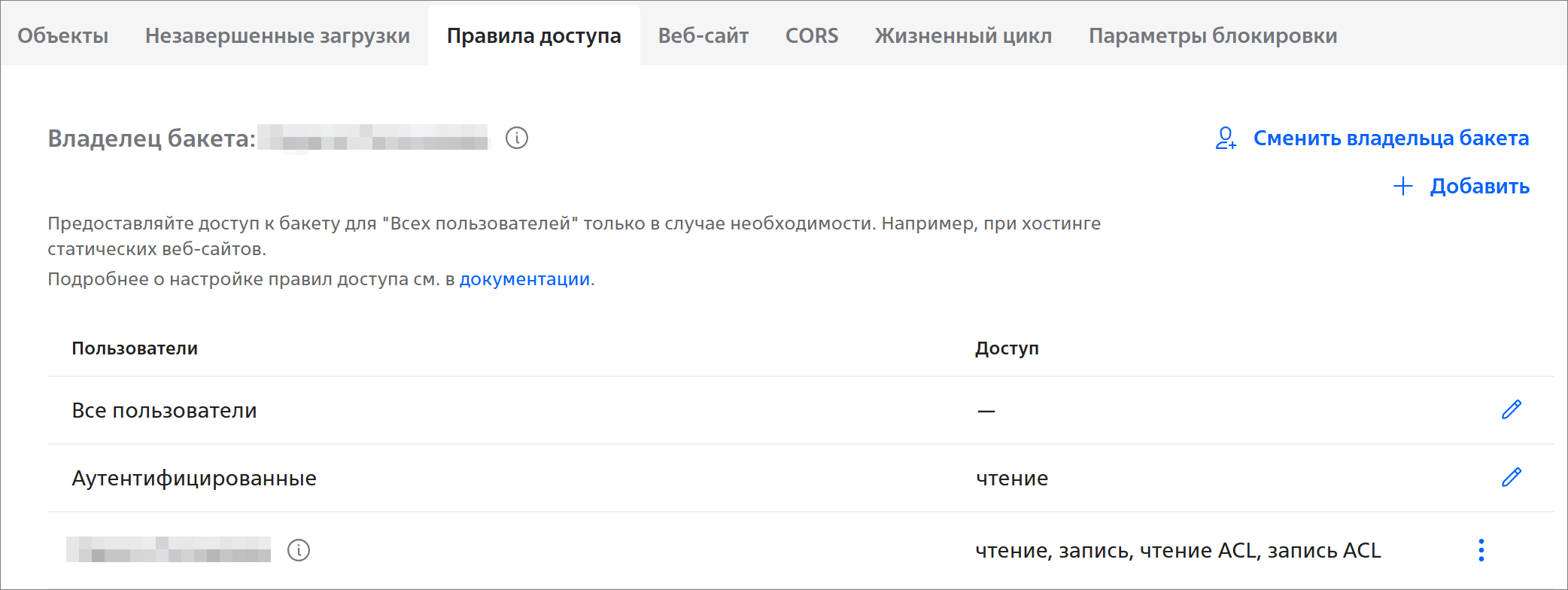 Вкладка Правила доступа отображает пользователей и их тип доступа к бакету: