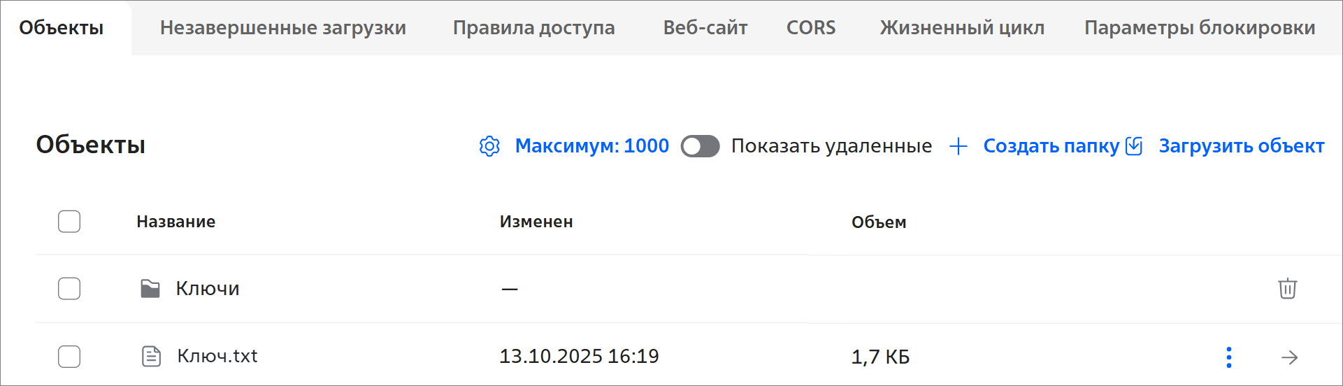 - копирование URL-ссылки для скачивания версии объекта (в бакетах с версионированием).